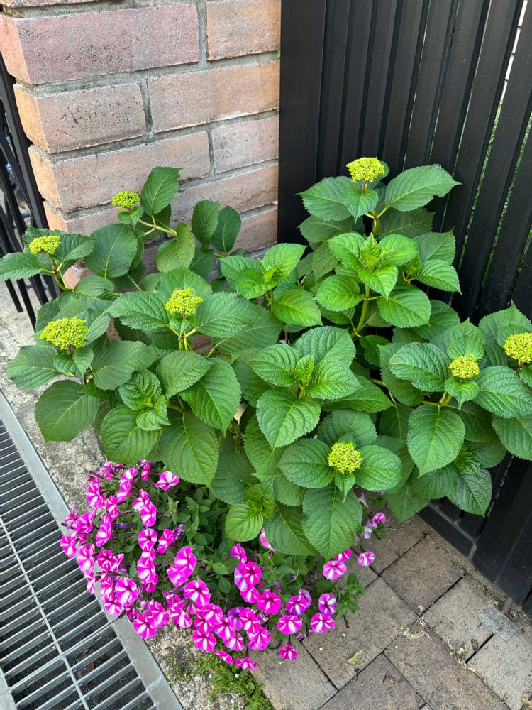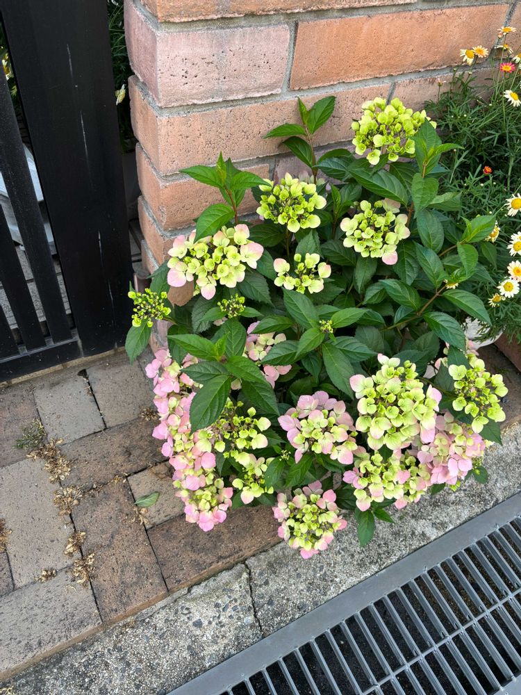 我が家の門扉の右側には①ラグランジアクリスタルヴェール2、左側には②アジサイサマークラッシュを配置しています。一昨日の雨と風でサマークラッシュは枝が曲がって広がっちゃいました💦