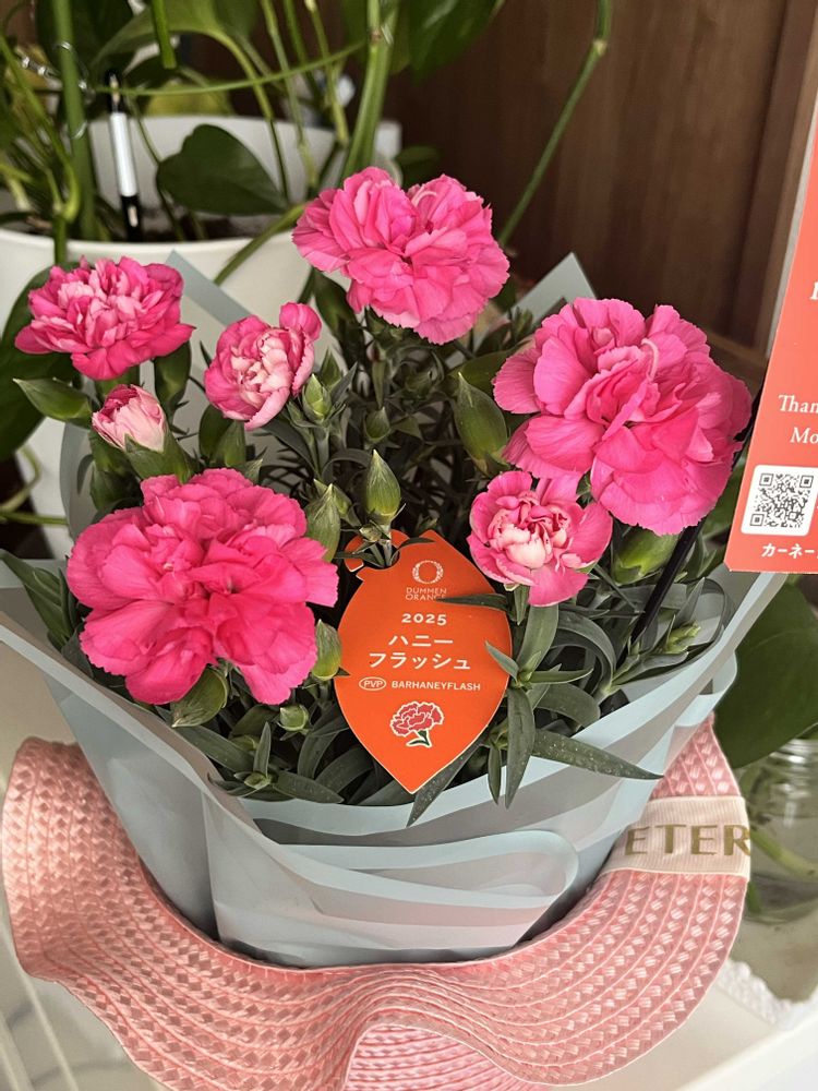 こんばんは✨ 昨日、母の日のカーネーションを購入して☺️ 今日、母に渡しました😊 とても喜んでくれて🎵ピンクの色も褒めてくれました🎶 ハニーフラッシュっていうのがあるんですね〜✨