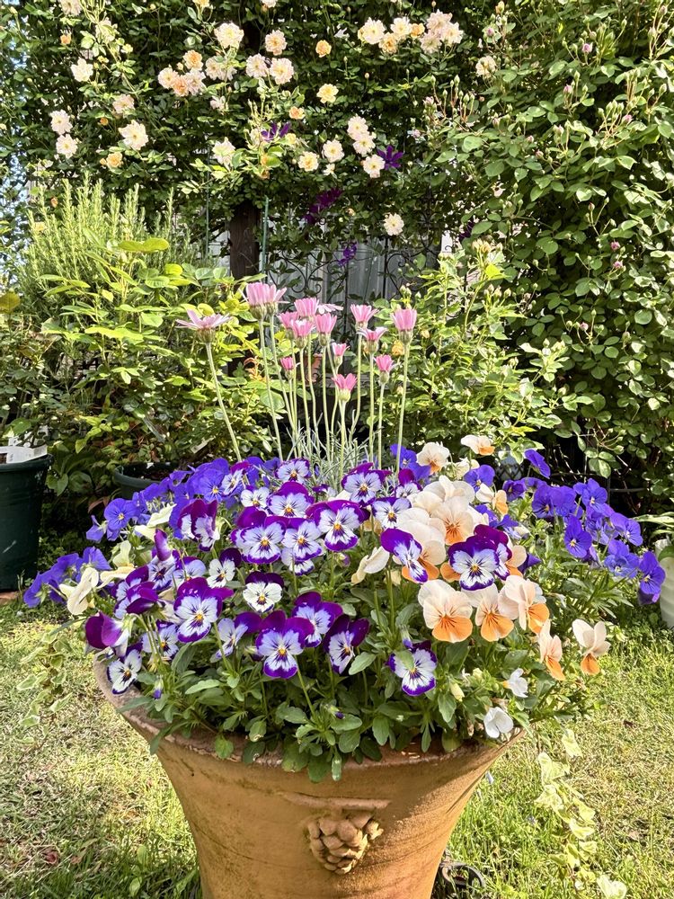 ③そろそろ終わりのビオラの寄せ植え🌸雨が降ったらグッタリとなると思うので、今のうちに撮っておきました😅