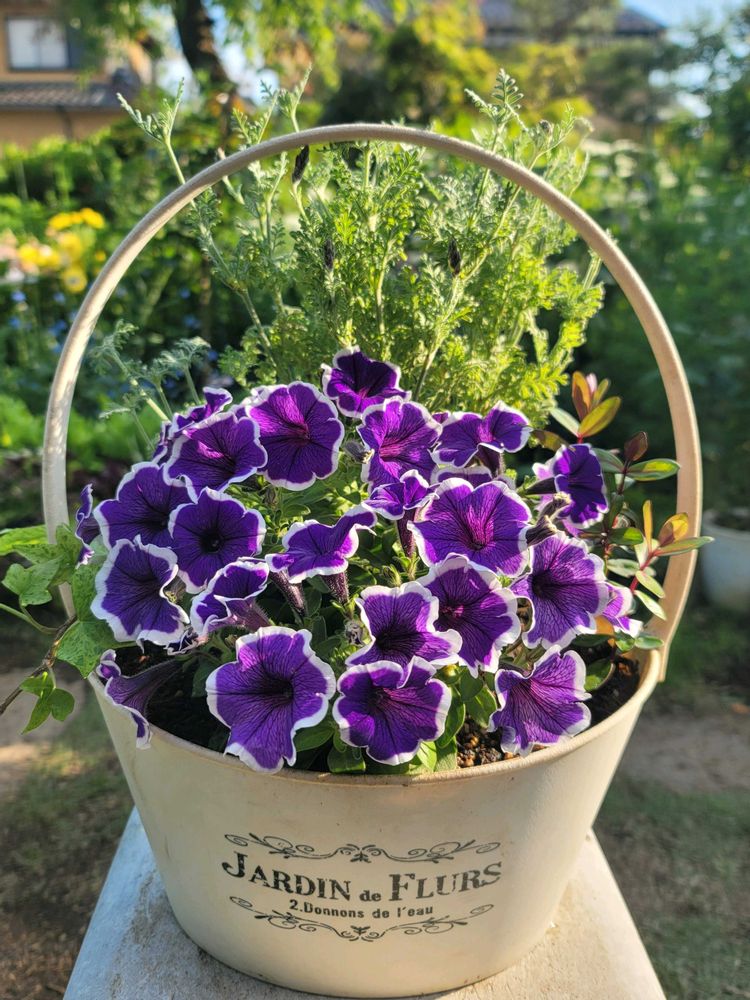 寄せ植えのペチュニアももうこんなに沢山咲いているのですね💜