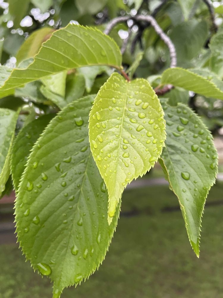 ちょうど雨が上がって、染井吉野の若葉が雨粒を纏っていました。