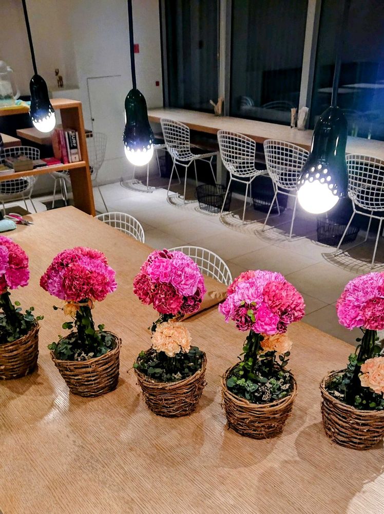 ①以前習っていた東京ミッドタウンでのフラワーアレンジメントのお教室で、カーネーションのトピアリーを作ったときのもの。最後に皆で並べて記念撮影。