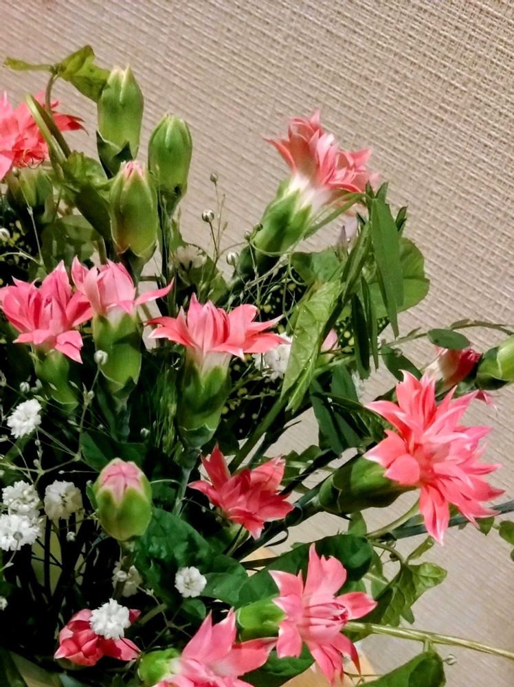 ④星咲きのスプレーカーネーション、スターチェリーテッシノ。実際はもっと青みピンクですが、夜室内撮影だと色が出なくて。