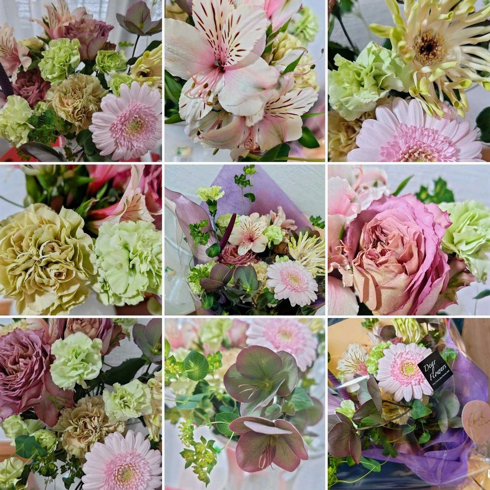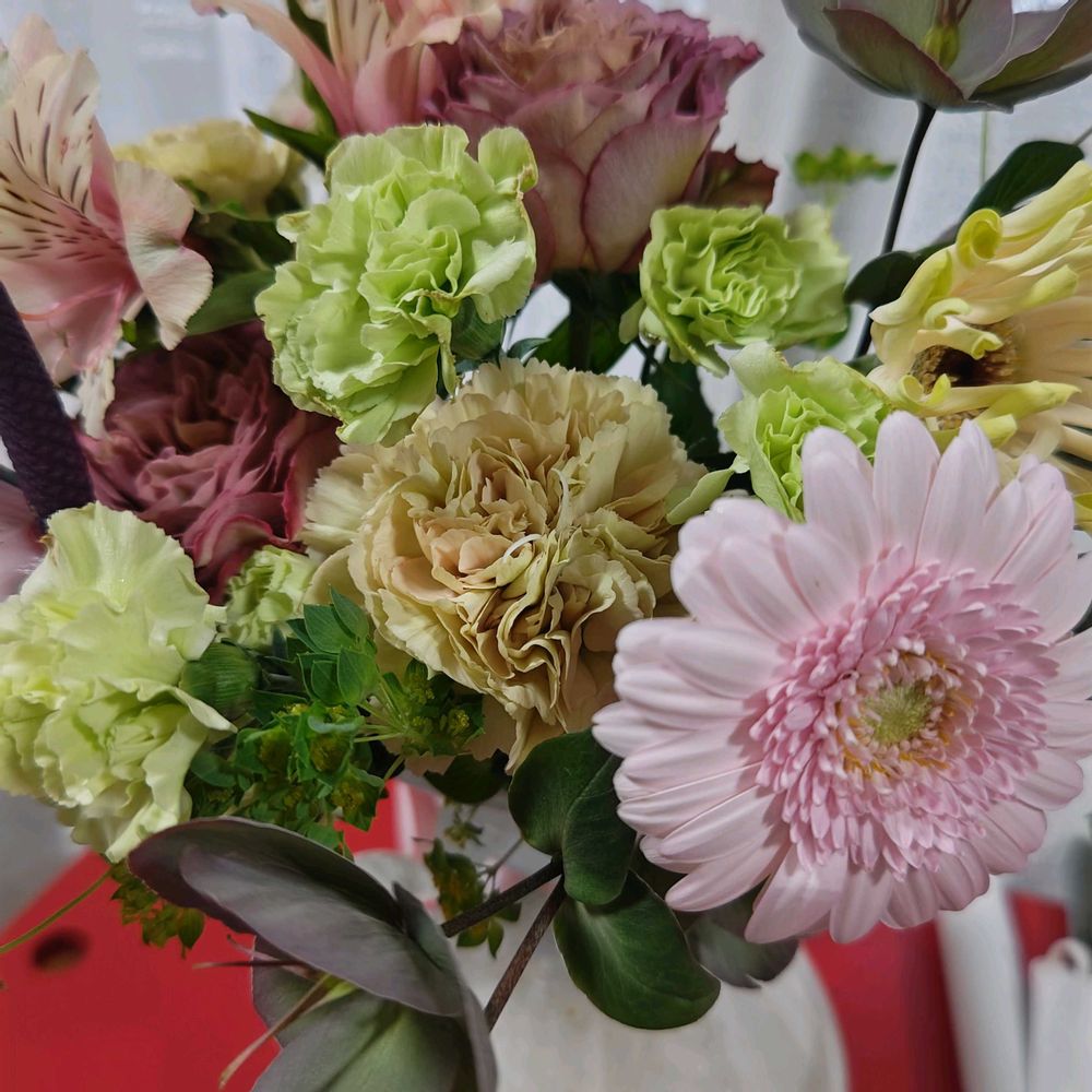 優しいグリーンや、ニュアンスカラーの珍しいカーネーションが沢山。私のイメージを電話で伝えて、作ってもらったそうです🤭どんなイメージ🤔