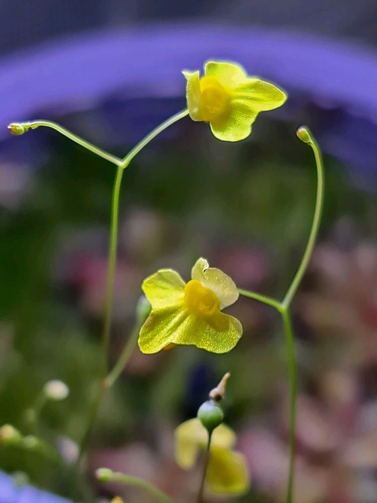最初ドロセラカーバラップの鉢からミミカキグサの様な黄色の閉鎖花が1本出てきたんです。カーバラップな?モウセンくゴケの様な形の白花なので何だろう?…暫くしたらいっぱい花茎が立ち上がってきて🐥ヒヨコだらけになりました。