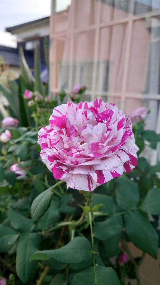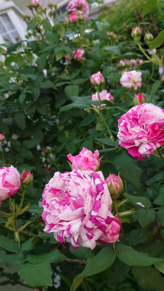 斑入りで香りの良いオールドローズです〜🤍🩷💕