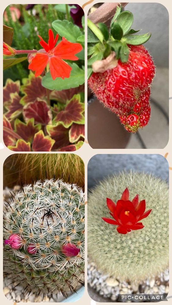 サボテン🌵の雪晃さん赤いお花がてっぺんに😵可愛い🎵😆名無しサボテンさんもお花こちらはピンク🩷我が家の今年初のイチゴ🍓なかなか良い色☺️まだ熟してないのでお預けです😅鳥さんに食べられないようにネットかけてます👌