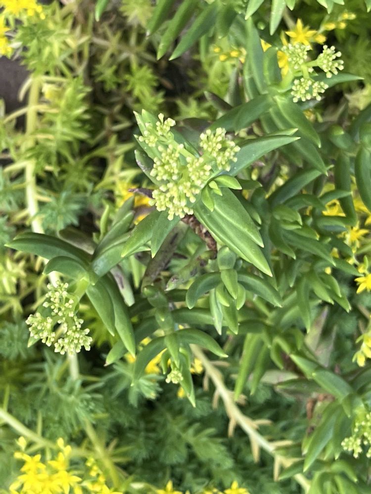 ③地植えの多肉の中で、テトラゴナに蕾が!はじめての花が見れそう。