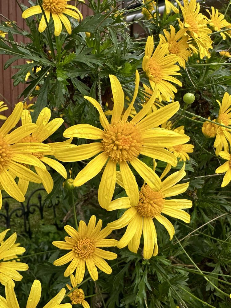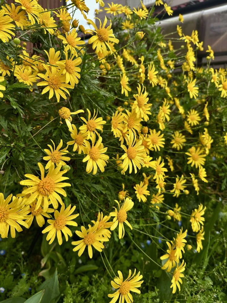 ユリオプスデージー🌼の葉っぱ🌿には細かい毛が密集しているので白っぽく見えるそうです。この子の葉っぱ🌿にはそういった物がないのでマーガレットコスモス🌼ですね。うちに来て既にうん10年、ずっと放置して来ましたが、毎年元気に咲いてくれています😄
