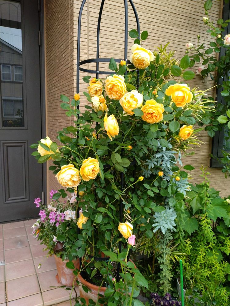 2枚目がゴールデンセレブレーションのオベリスク仕立てなんですが、挿し木から3年目もう少し誘引の幅を密にすると、もっと一面に咲くのかも…
