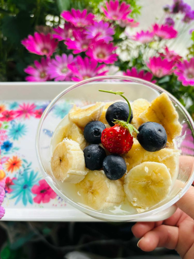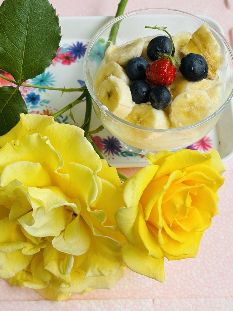 ②朝食のフルーツヨーグルトの真ん中に添えてみました🍓