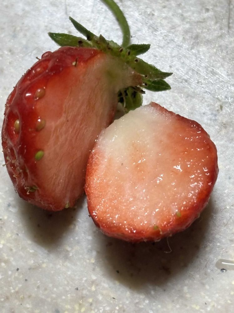 🔪🍓カットしたら、中も紅くみずみずしい断面をパチリ
