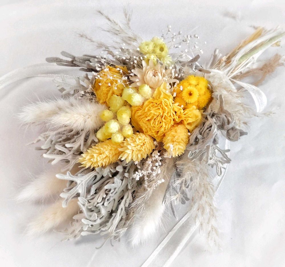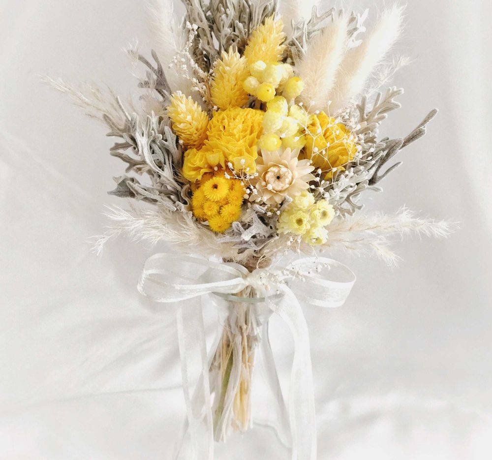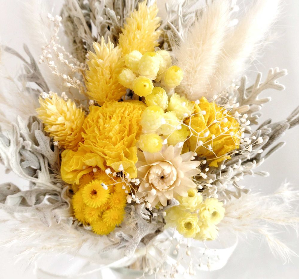 黄色のラナンキュラスとレモンイエローのイエローダイヤモンドがドライになったので束ねてみましたー🌜🌠