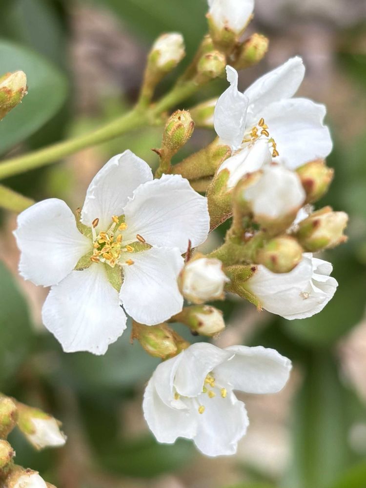 植えた覚えのないシャリンバイ、蕾がついてるな〜と思ってたら今朝たくさんの花が咲いてました❣️