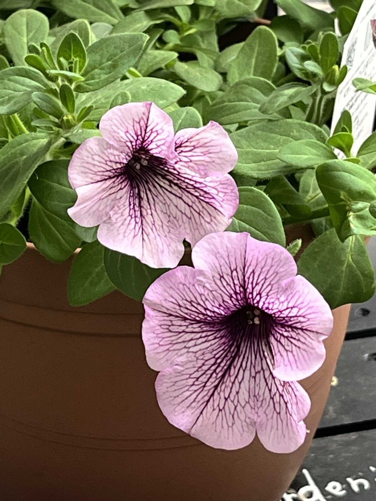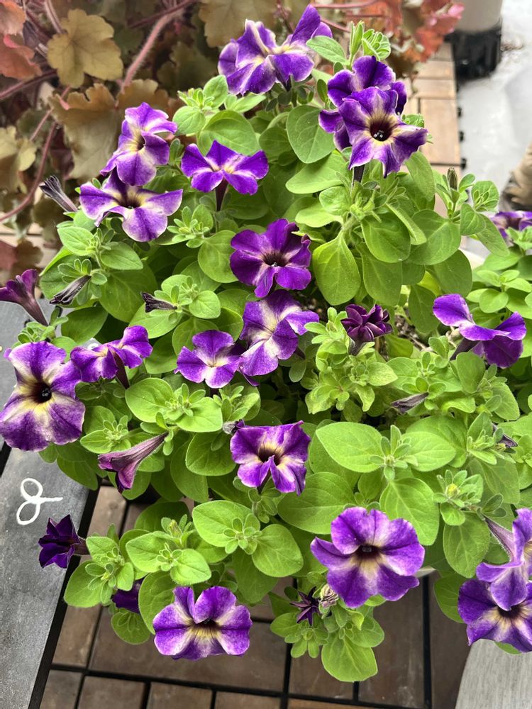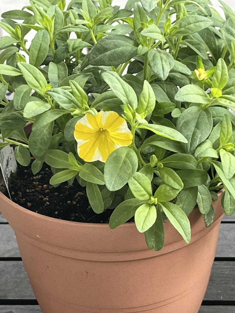 こんにちは✨今日は☔️です 1️⃣冬越しした☺️サントリーサフィニアアート・ブルーモーメントの花数が増えてきました🎵 2️⃣こちらも冬越ししたPWスーパーベルレモンスライス✨去年より株が、モリッとなって😆花が咲いて嬉しいです😄 3️⃣先月買った🍀サントリーサフィニア・ラベンダーレース✨花が咲きました😊落ち着いた綺麗な色です🥰
