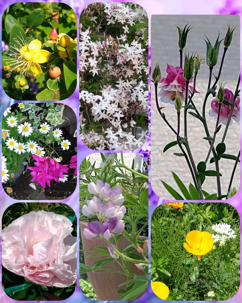 今咲いてるお花です、左上から時計回りに、ヒペリカム、ハゴロモジャスミン、オダマキ、カリフォルニアポピー、矮性ルピナス、芍薬、ノースポールとイキシアです🥰