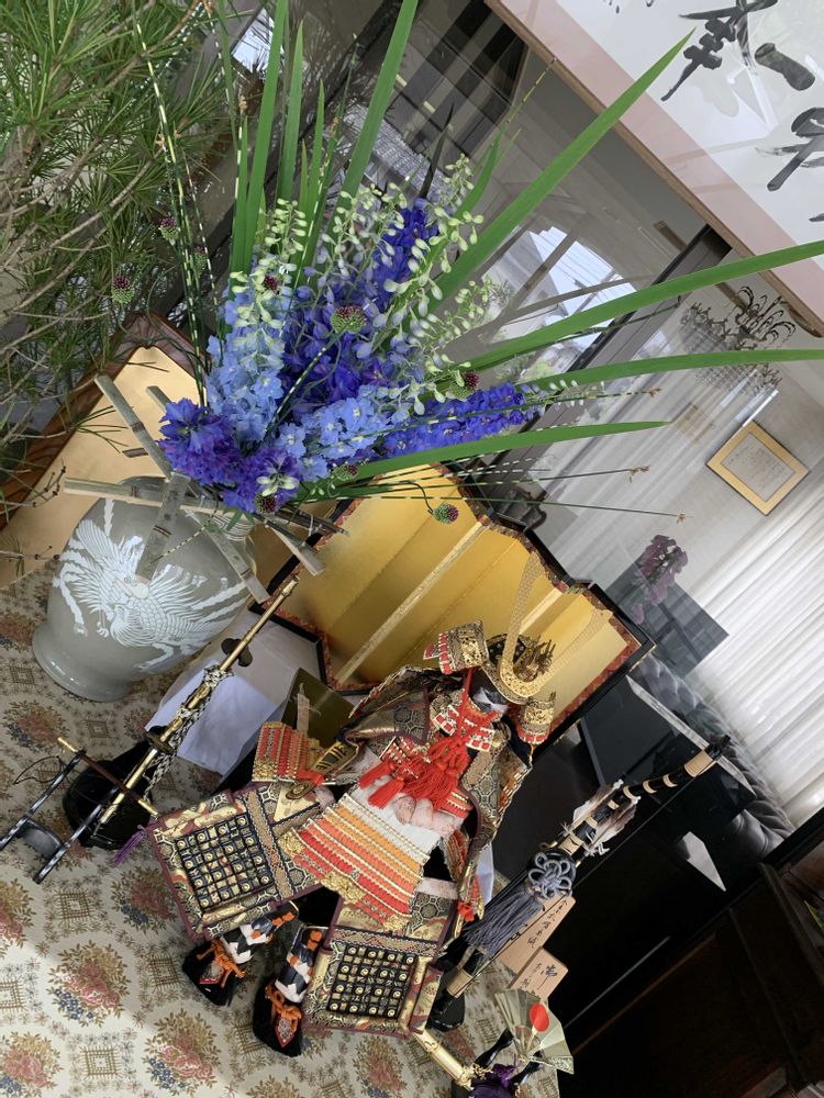 こどもの日 生け込み 立派な兜様に負けぬように真っ直ぐに伸びた刀の様な葉と濃いブルーの花の組み合わせにしてみました。