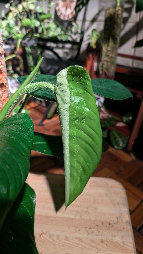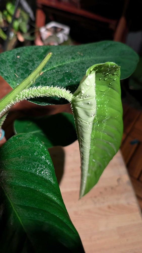 フィロデンドロン・ジェネヴィビアナムの新芽が開きそうです😳 茎もふさふさで可愛いし楽しみ😚