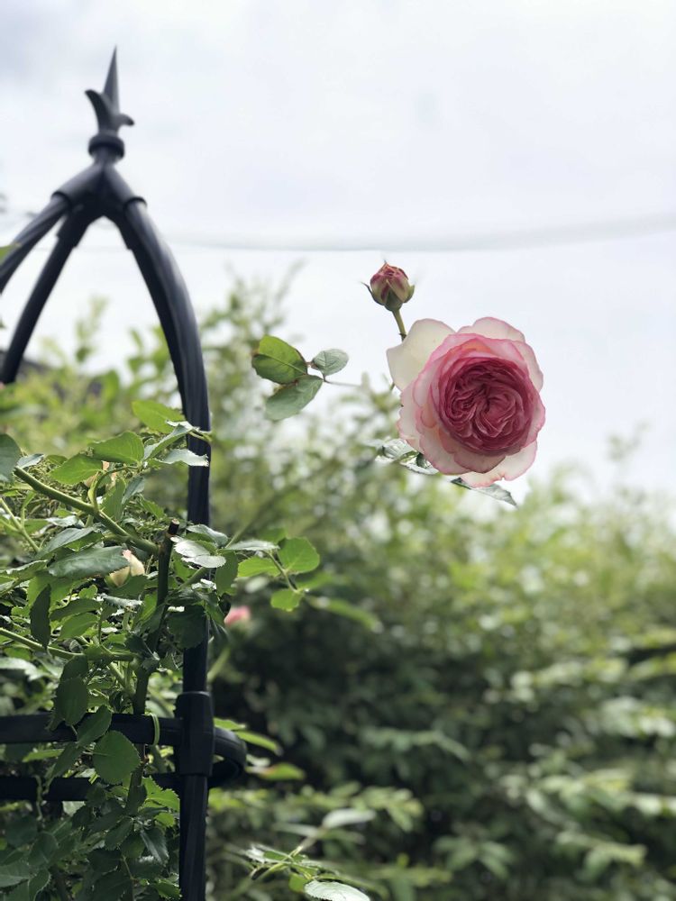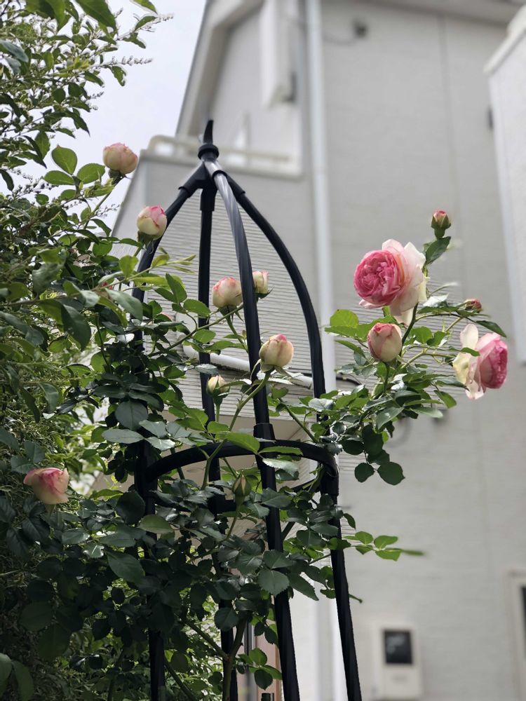 ②去年新苗で買って、夏か秋にシュートが出たのをそのままにしてしまい、ぶっとくて誘引できなくて高いところで咲いてます