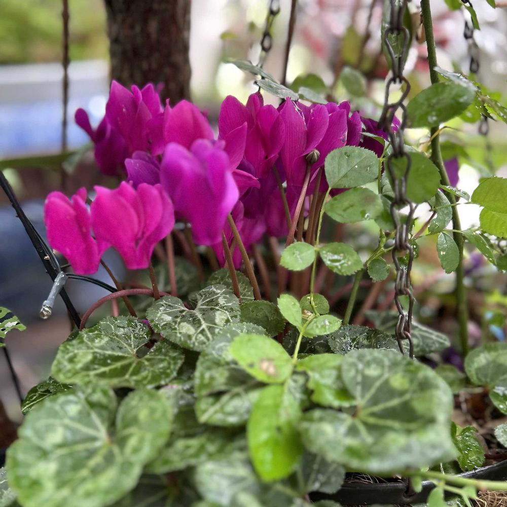 フェイジョアさんがここ数年で急に大きくなりすぎて。フェイジョアの枝にハンギングかけてるので、日陰でシクラメンさんにはちょうどいいのかしら?