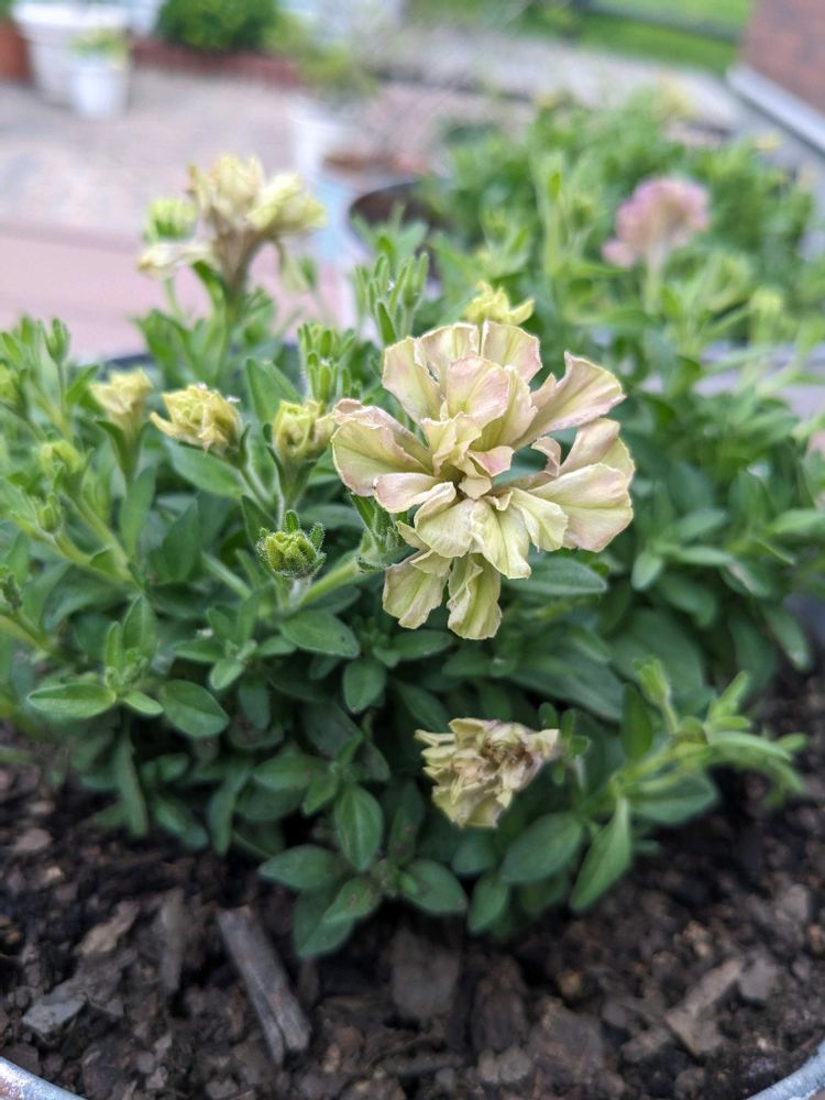 小輪八重咲きのライムグリーンが可愛い💕ペチュニアって葉がベタつくイメージで今まで敬遠していましたが、触っても全然気にならないです😲 蕾が密にたくさんついてて、咲いたら豪華になりそう💚