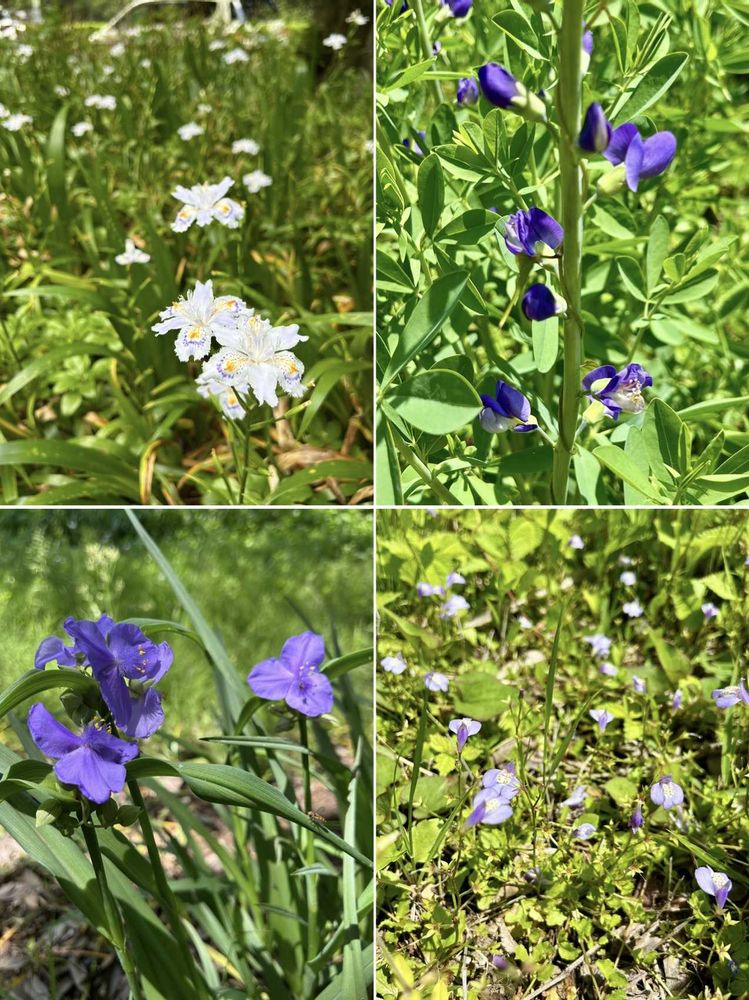 2枚目:シャガ、ムラサキセンダイハギ、ムラサキツユクサ、ムラサキサギゴケ
