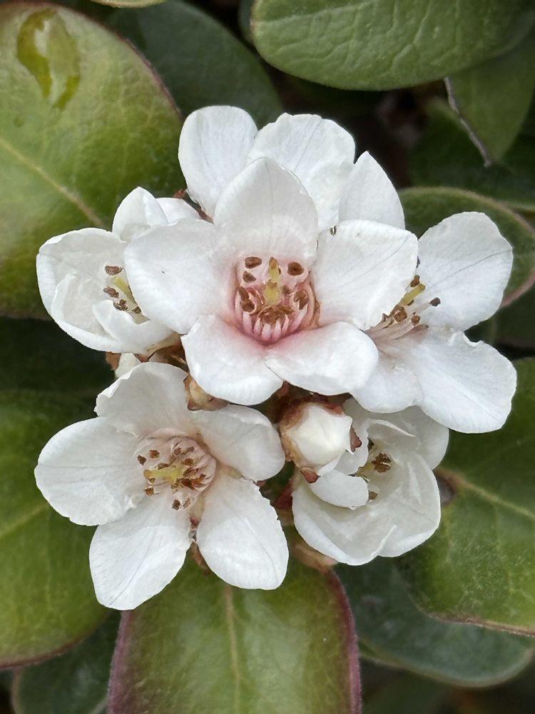 Rhaphiolepis indica var umbellata/Rhaphiolepis. Rosaceae. Rosales. Magnoliopsida. Tracheophyta Commonly called/Indian Hawthorne. Yeddo Hawthorne. Sexyon’s Bride Native to/Japan. Taiwan. Korea Symbolism/Protection. Good fortune *Genius of about 3-5, possibly up to 15 species. *Bushy, spreading, evergreen shrub producing narrowly lance-shaped,deeply toothed, dark green leaves. 3-41/2in(7-11cm)long. *Fragrant, White to light pink flowers, 1/2”wide(1.27cm) bloom in spring. *The founder of this cultivar isn’t documented. *In Japan this flower was used as an astringent and for dyeing. Photographed 5/8 9:28am 2025 Posted 5/9(Friday) 11:33am 2025