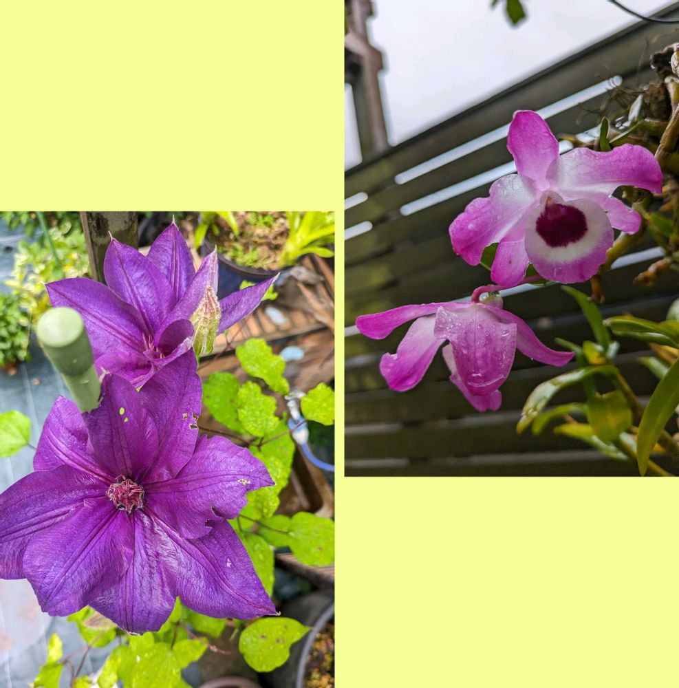一重咲きのクレマチスと木に巻き付けてるデンドロビウムが綺麗に咲いてる。