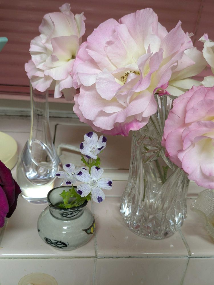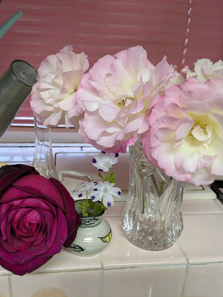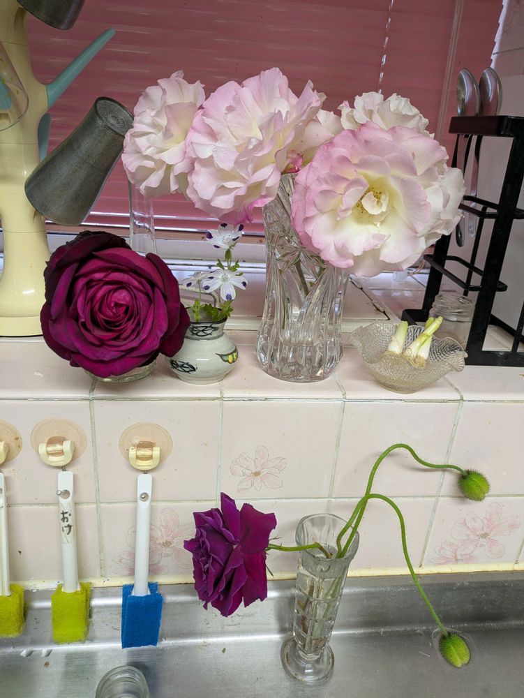 もうすぐ散りそうなマチルダをキッチンで楽しんでいます。風に吹かれすぎて、傷んできたゲーテローズもカット。