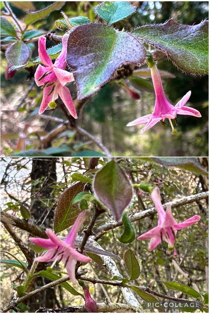 ピンク色のウグイスカグラが慎ましやかに可愛い花をつけています😍