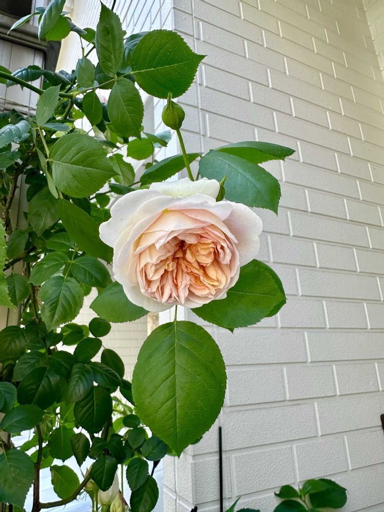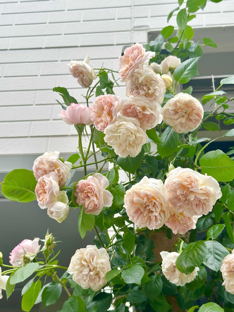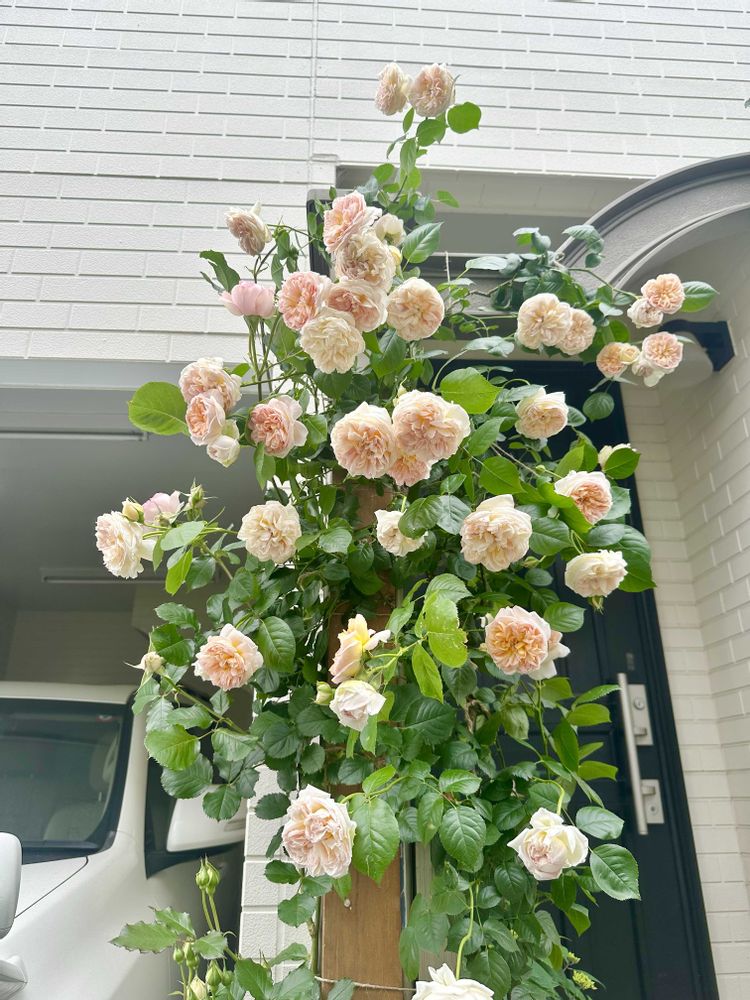 左側が車庫なので、なるべく右側にと誘引していたけどやっぱり左を向く。左側から陽が当たるので仕方ない。しばらくは車は出さないでもらいましょう〜。