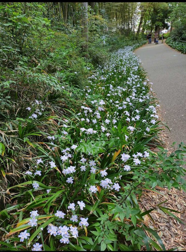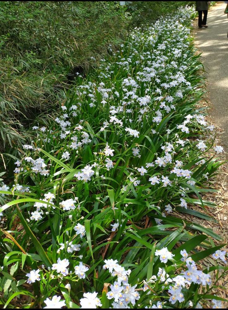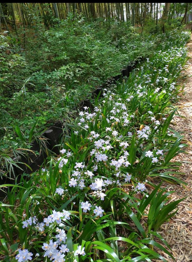 池のあるせせらぎ公園の入り口から20m程続く道にシャガのお花が植えてあり素敵な小道です