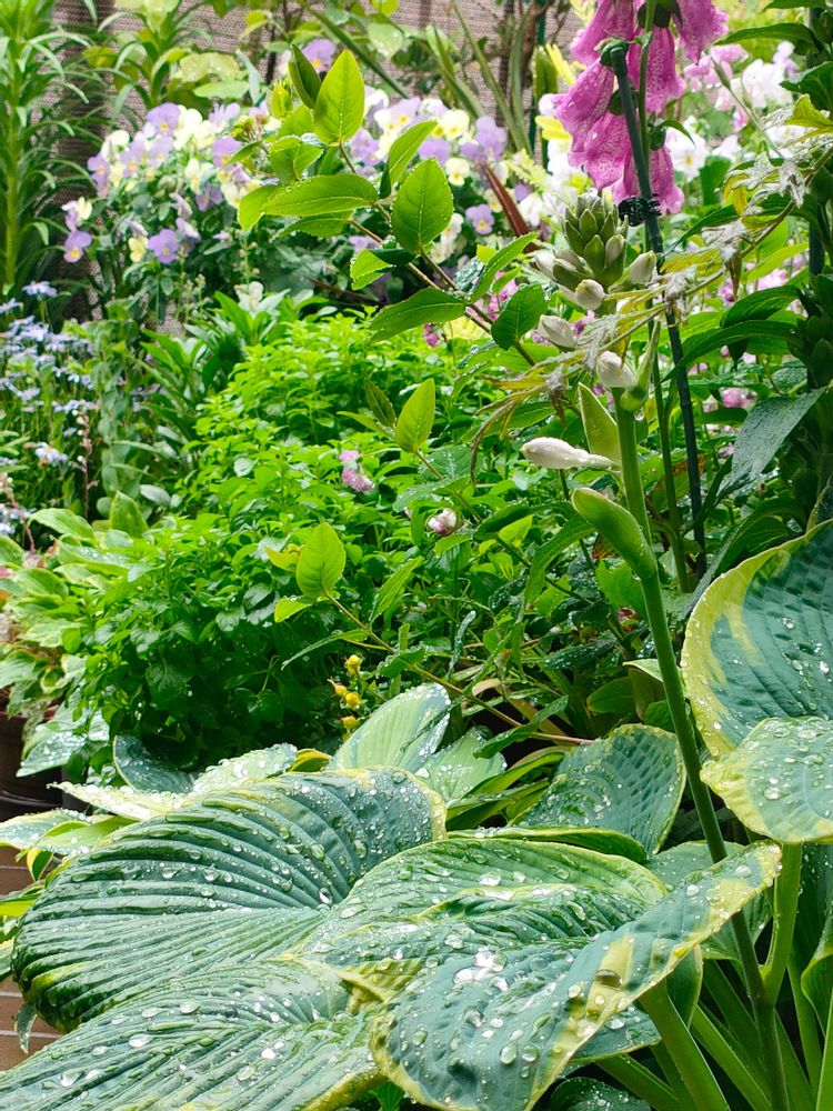 ギボウシの葉っぱの上で🌱雨粒さんがたくさんあそんでますね。