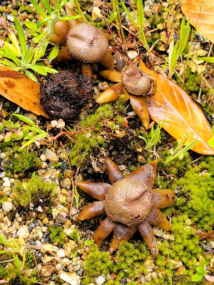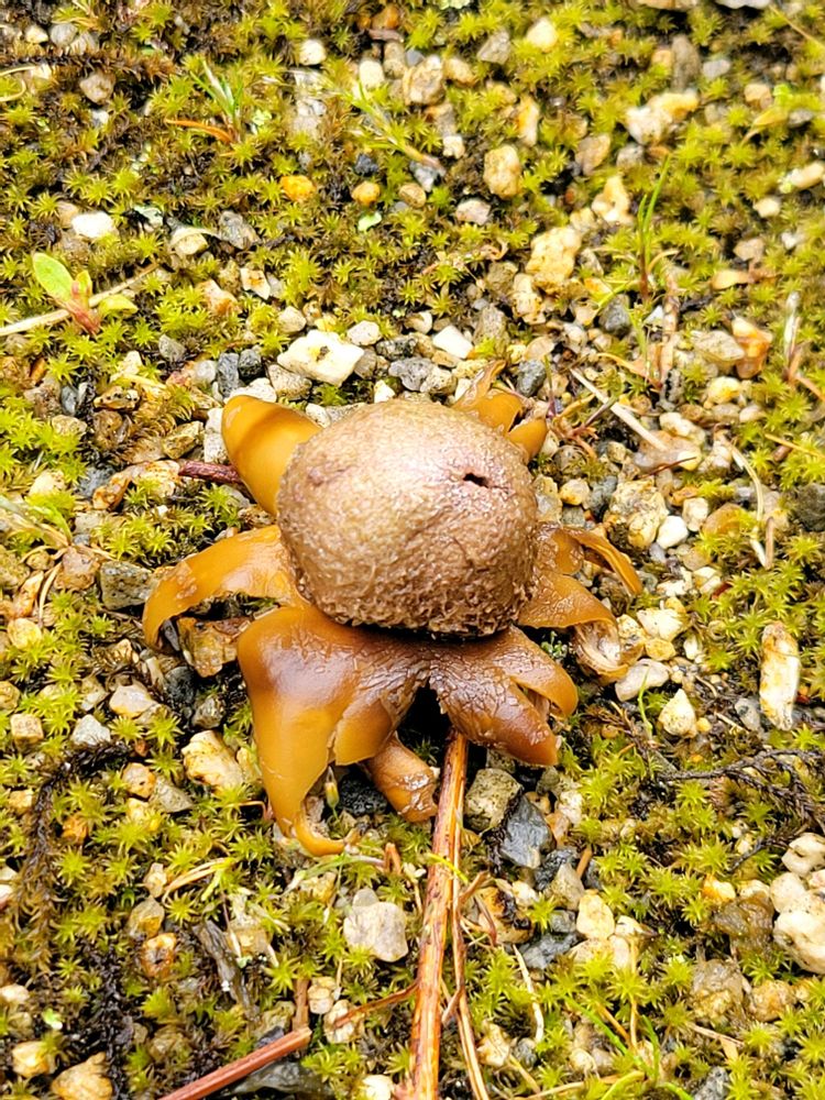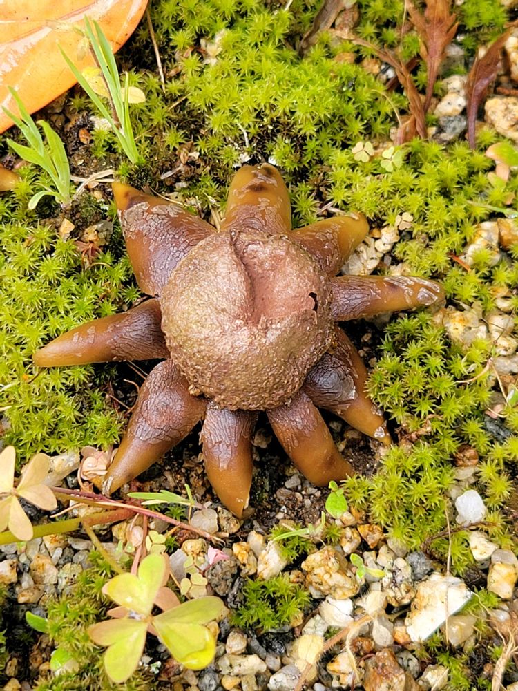 調べると、ツチグリと呼ばれるキノコで、土の地面に発生する子実体(キノコ)がクリの毬(いが)が弾けた姿に見えることから名付けられたとのこと。