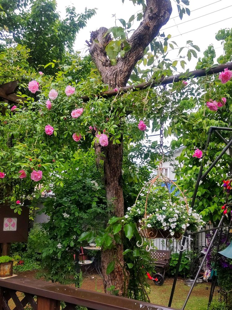 木が中心の庭です。 好きな所に好きな植物を植えています。 鳥さんがやって来て ... いろんな贈り物をくれました。私と鳥さんとの合作の庭です。 又、雑貨が好きで手作りが好きで、あちこちにぶら下がっています。