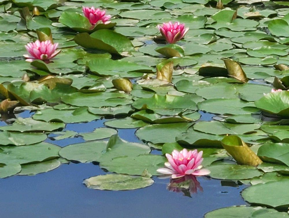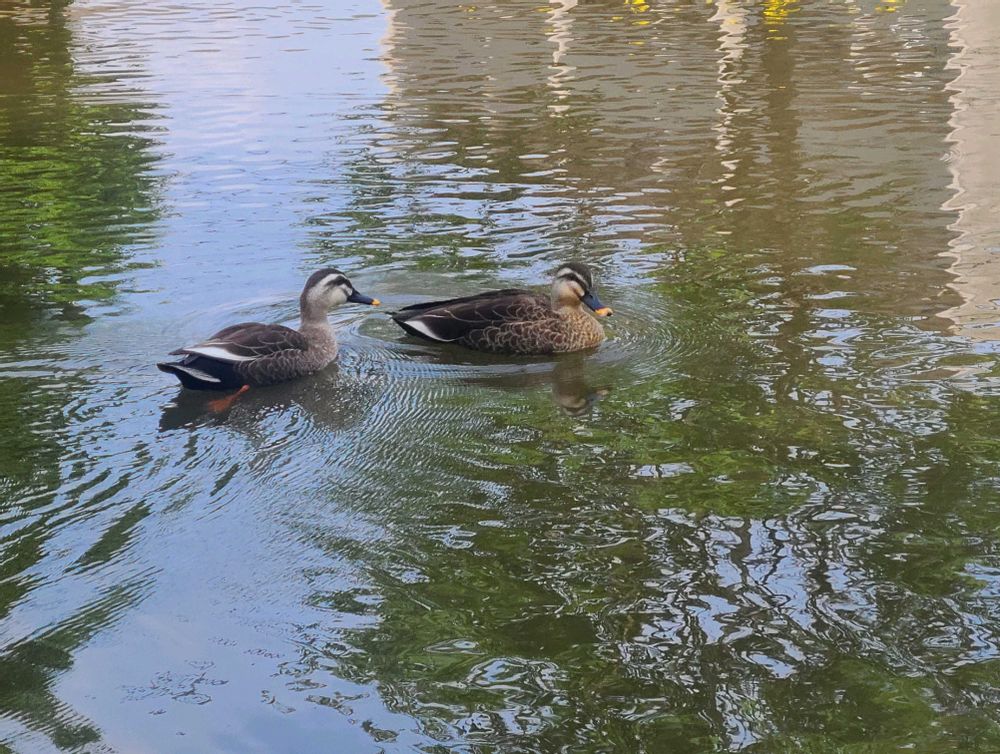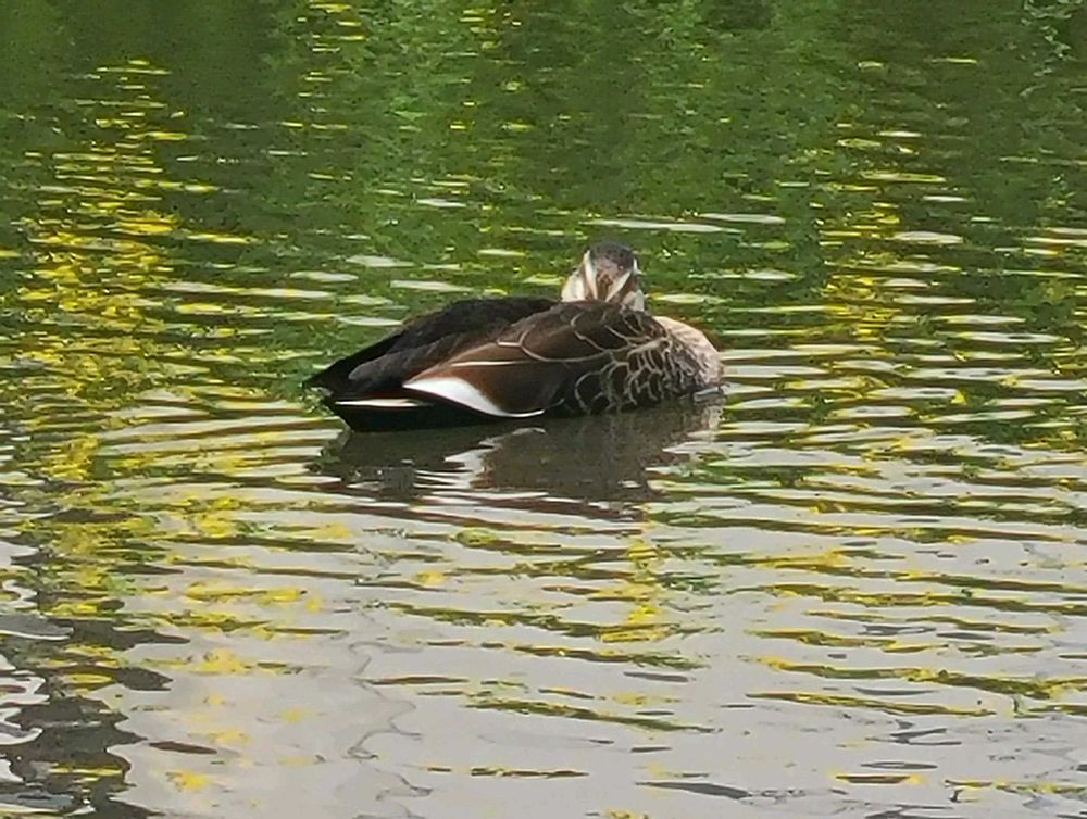 3️⃣黄菖蒲映る水面で寛ぐ鴨さん