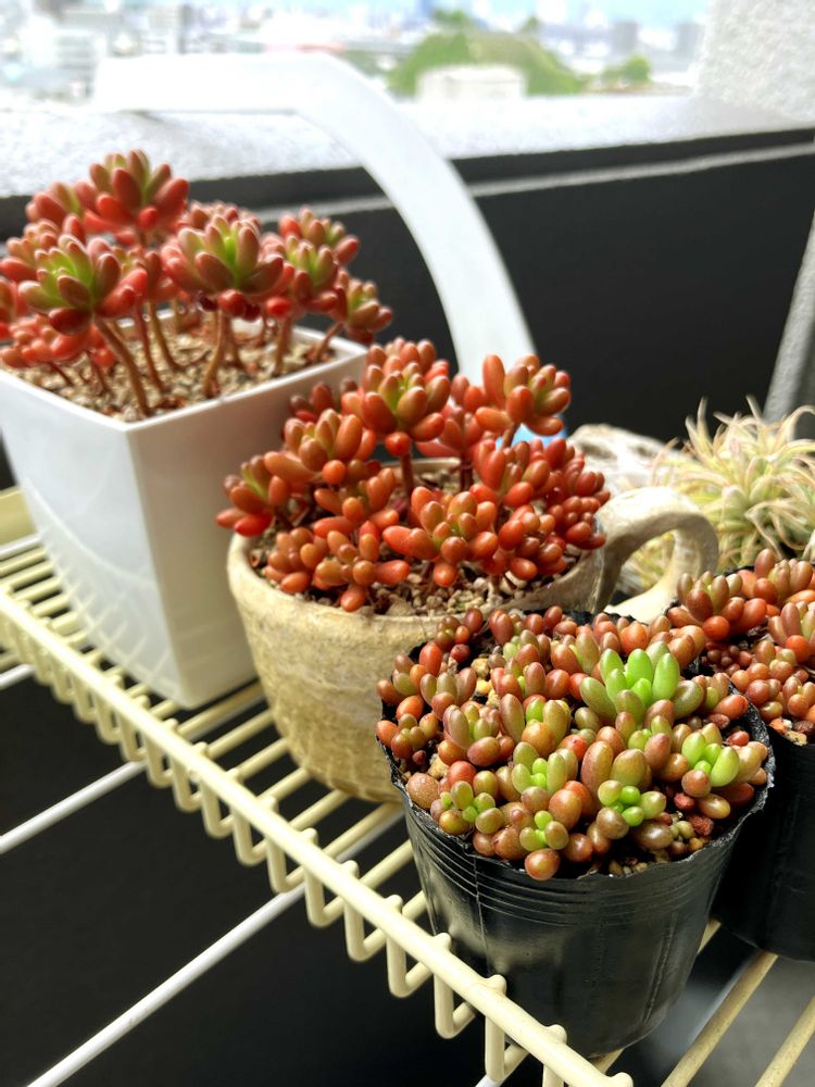 左と真ん中は古株さんです!下葉が落ちて徒長してますが、これはこれで可愛い🩷手前は今年古株から挿し木したものです😊虹の玉は無限ループですねー