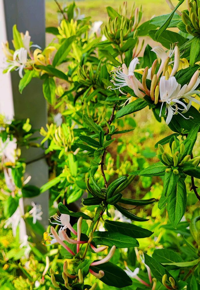 スイカズラ(ハニーサックル)が開花しました。数種類育てていますが、原種?のクリーム色の常緑性の子がいちばん密によく咲きますね。落葉性の園芸種のなかでは、ゴールドフレームが性質が強くてぐんぐん伸びて、派手で大きい花を咲かせてくれます。どれもいい香りです。