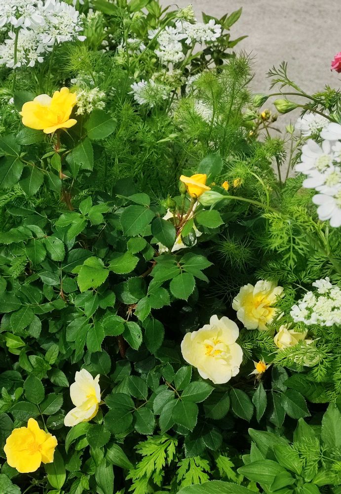 バラ サニーノックアウトがオルレアに埋まって咲いてます。ここはバラ花壇なんですが、オルレアやニゲラなど一年草の種ばら撒きで育ったものや、原種のアルストロメリア、オレンジミントなんかでワッサワサです。