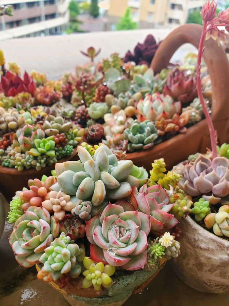 多肉5年生になりました(*´﹀`*) 狭いベランダでチマチマと🎶 癒しを求めてニヤニヤ眺めています•*¨*•.¸¸♬︎ 今年度中に引越しのため、どうやって運ぶか悩み中……🤔
