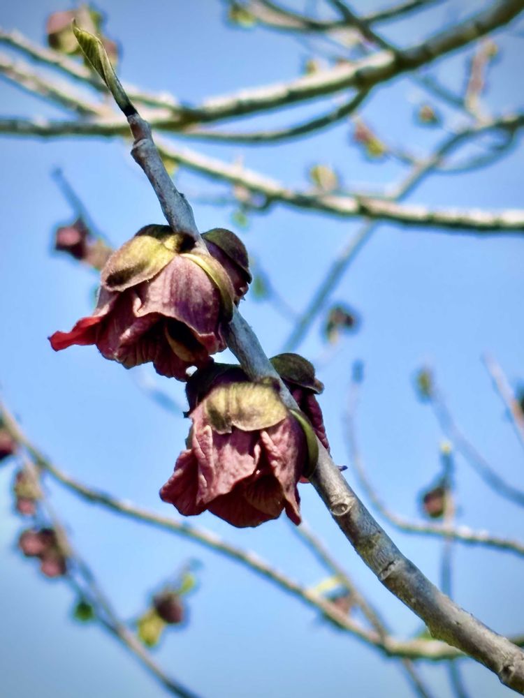 家のポポーの木は、100年位になるポポーの木です。チョコレート色のシックな花が咲いてます。🌸