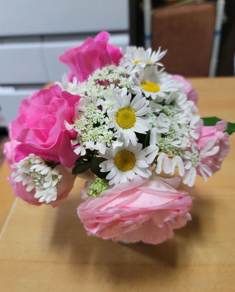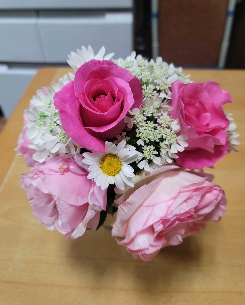 カットしたピンクのバラ達と白いオルレアやマーガレットがバラを引き立ててかわいらしいですね🩷🤍