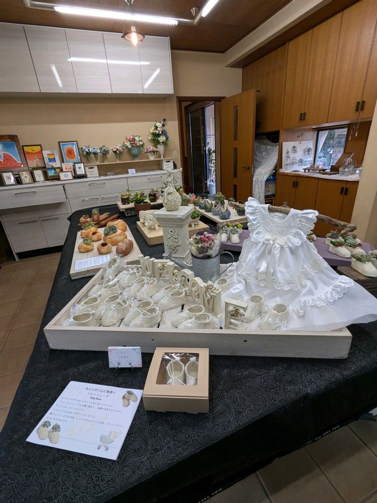 ショップの表には、花苗も売っていました。中は、どれも目を見張るアーティスティックな作品ばかり。cookieさんの多肉寄せ陶芸のパンは、こんがりして美味しそうでした。ベビーシューズの陶芸は、赤ちゃんの産まれたお祝いにぴったり!