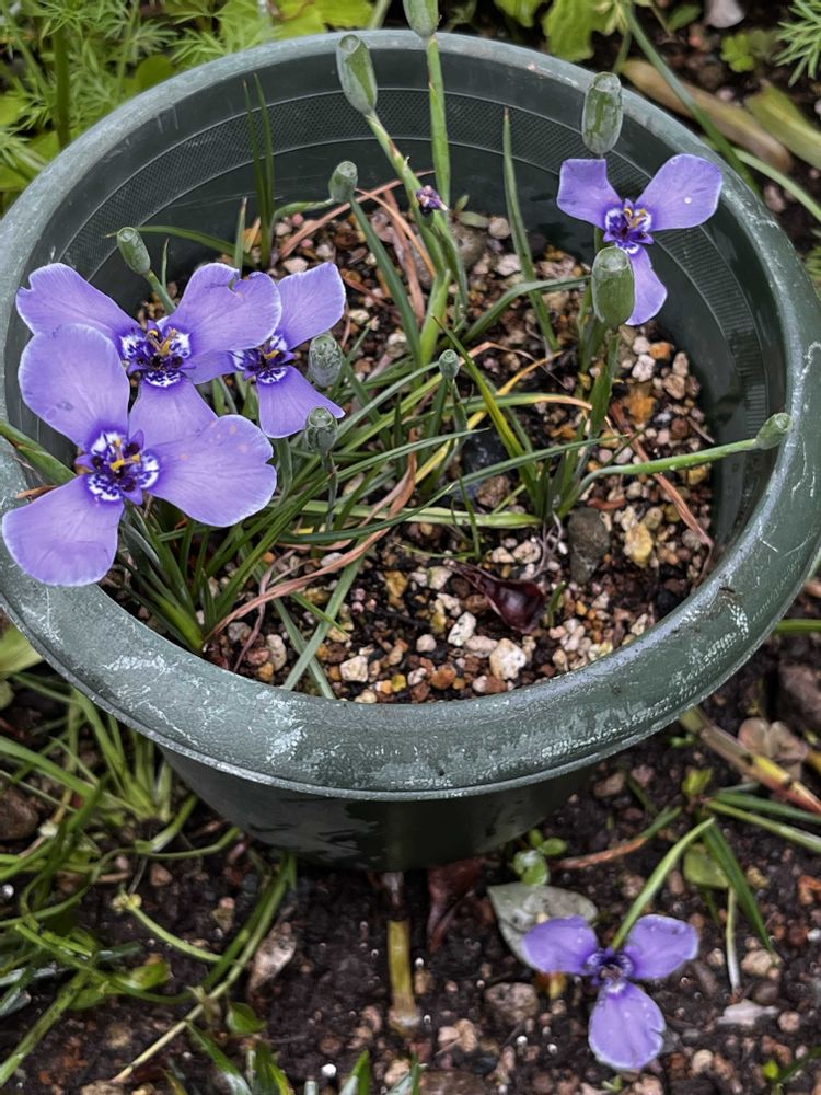 チリアヤメ 気が付かずにいて もう種がいっぱい付いていて 溢れ種が 地でも咲いていて 嬉しくなり シャガやめて 紫のお花集めました