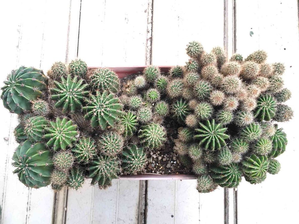 エキノプシスの短毛丸らしきものがてんこ盛りですね。もしかしたら花盛丸もまざってるかも? トゲがかなり痛いので植替えの際は軍手や厚いゴム手袋などを装着してくださいね。また、使い古しの箸(木星ではなくお弁当用にありがちなプラ製)があると小さい株をつかみやすく便利です。割り箸や木製の箸ではトゲが箸に刺さって抜けなくなって大変ですのでおすすめしません。サボテンは冬以外は植え替えても問題ないのですが、多分これだけの量を夏に植え替えるとなると人間のほうが体力奪われるので、涼しくなってからのほうがいいでしょう(主に人間にとってw)。サボテンは鉢の大きさに合わせて成長することが多いので、大きい鉢に植え替える場合はその分大きく成長し、短毛丸であれば15cmほどにもなりますので、そのへんちょっと考えてから植え替えたほうがいいでしょう。私なら、これだけあるのものはなかなかないので、大きく育てたいものだけを2~3個抜き取って、大半はそのままにしたくなります。素敵な鉢です。