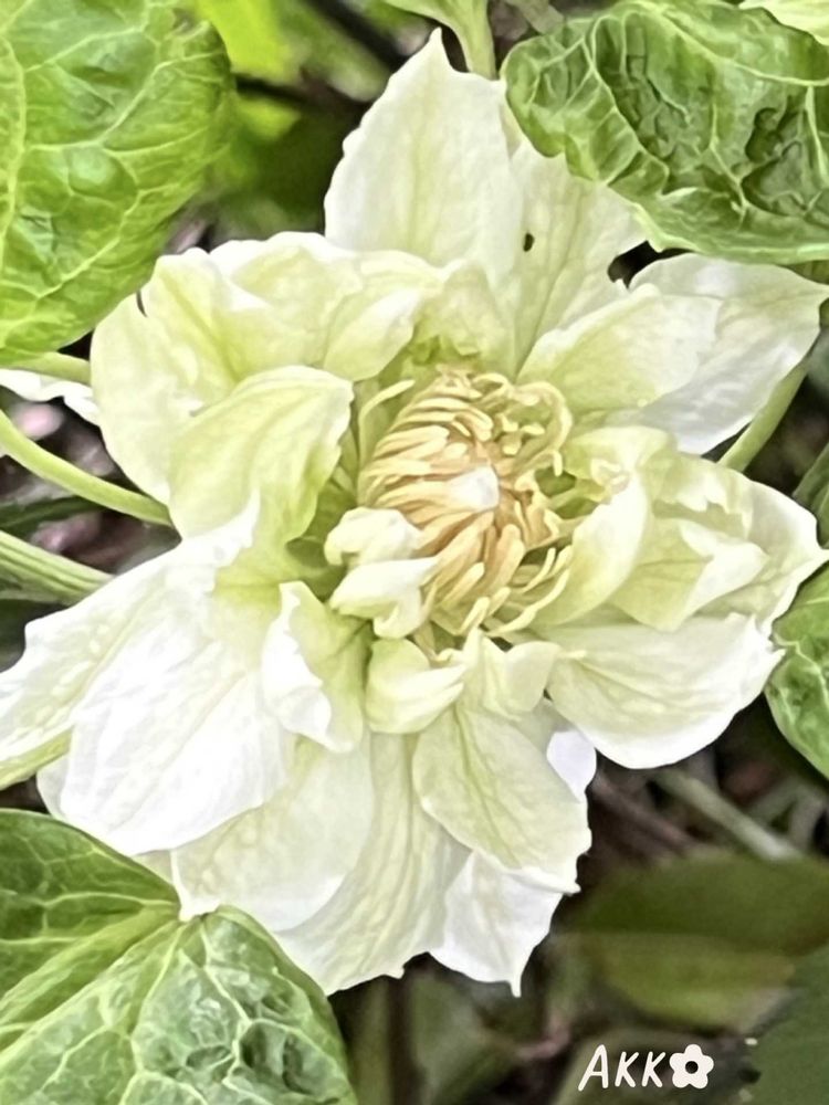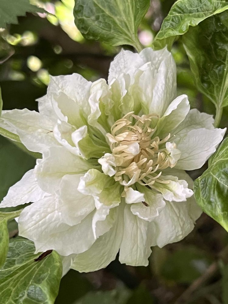 秘密の花園の奥の、白い万重咲きのクレマチス