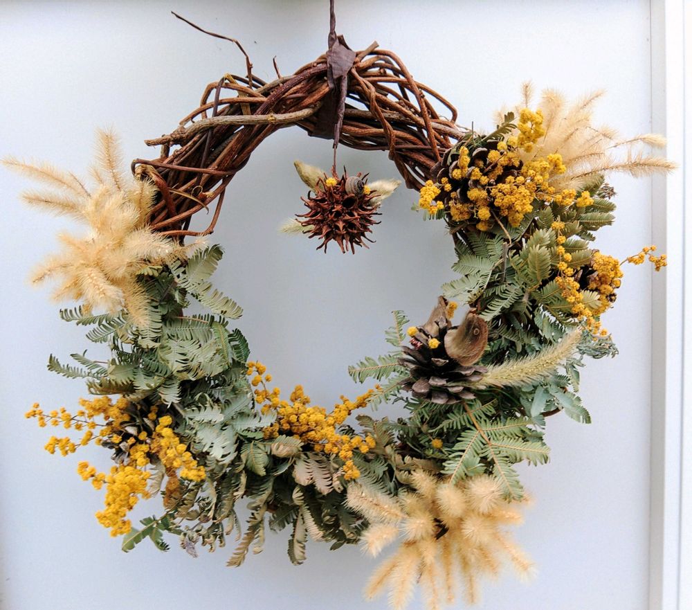 飾り:ミモザ(ギンヨウアカシア)の花と葉、エノコログサ、マツボックリ