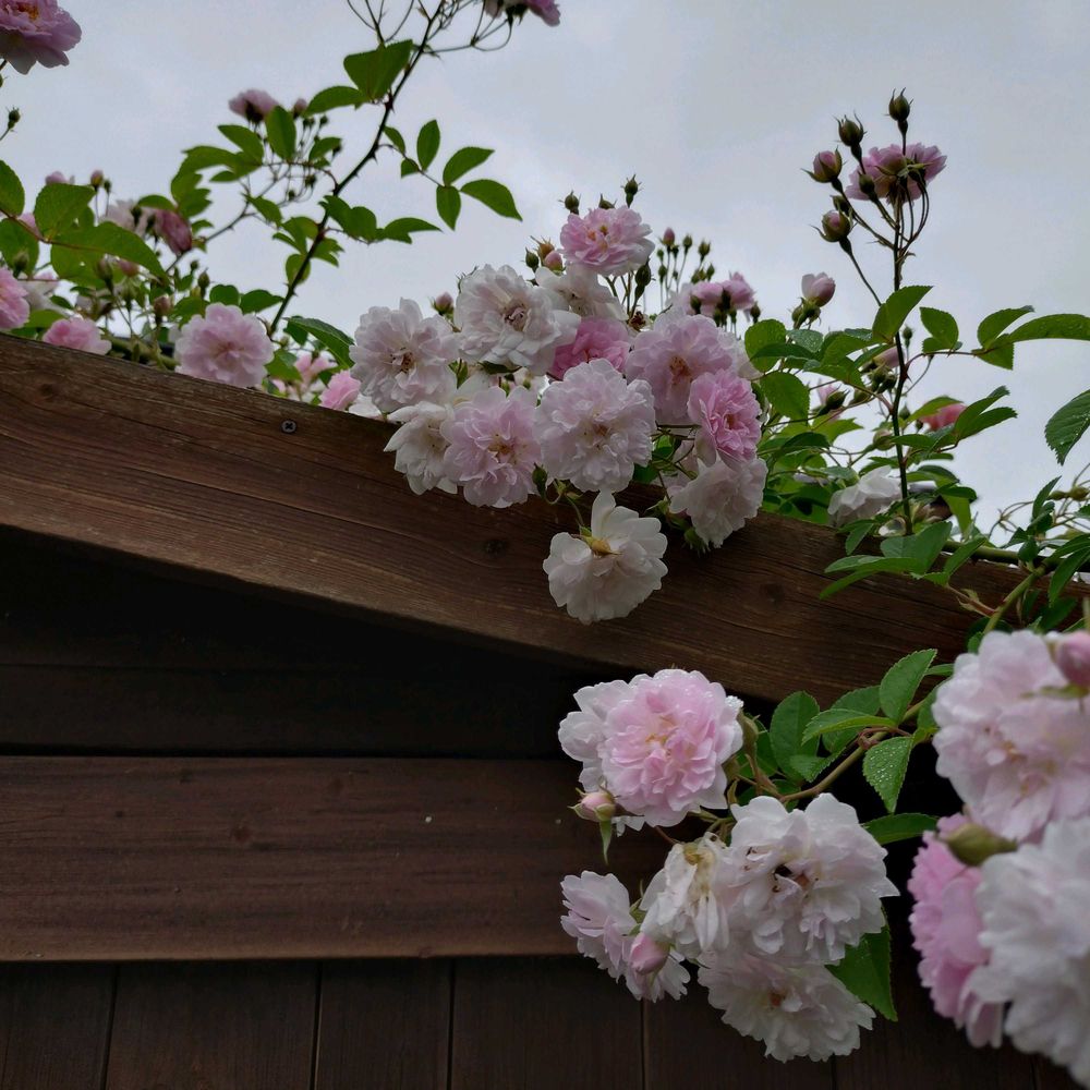 ポールズさん、ガーデンシェッドの屋根に誘引なのですか?素敵✨屋根から覗いた姿が可愛いです😊💓