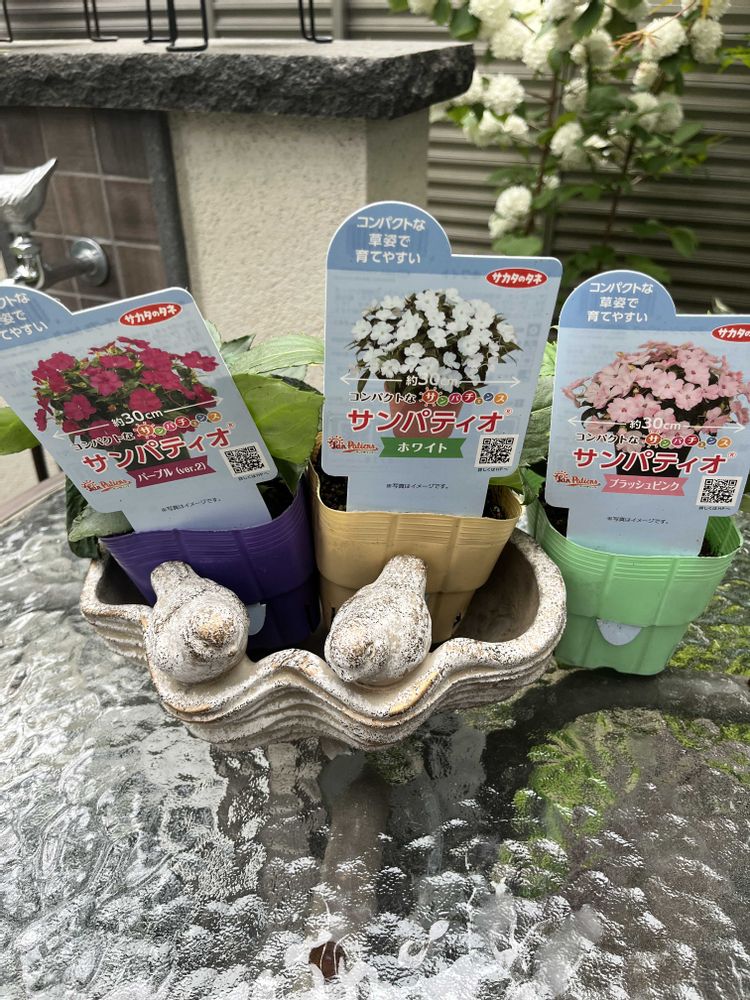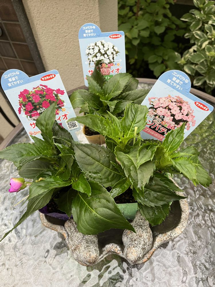 サンパティオは初めてですが、ここ何年かインパチェンスの白が我が家には欠かせないぐらい気に入っていたので、親戚のような(?)サンパティオをしかも3色もお迎えできてとても嬉しいです!
