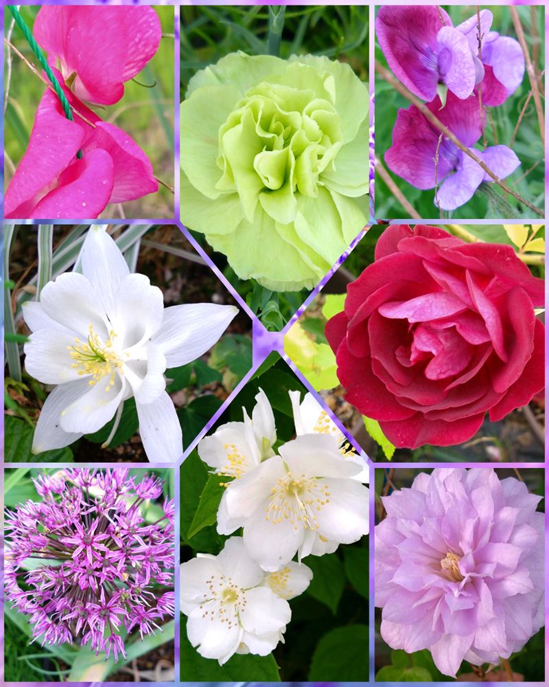 玄関、畑の花壇に咲いてるお花達です、左上から時計回りに、スイートピー、スプレーカーネーション、スイートピー、🌹バーガンディー、クレマチス、サツキバイ、アリウム、オダマキです😊✌️